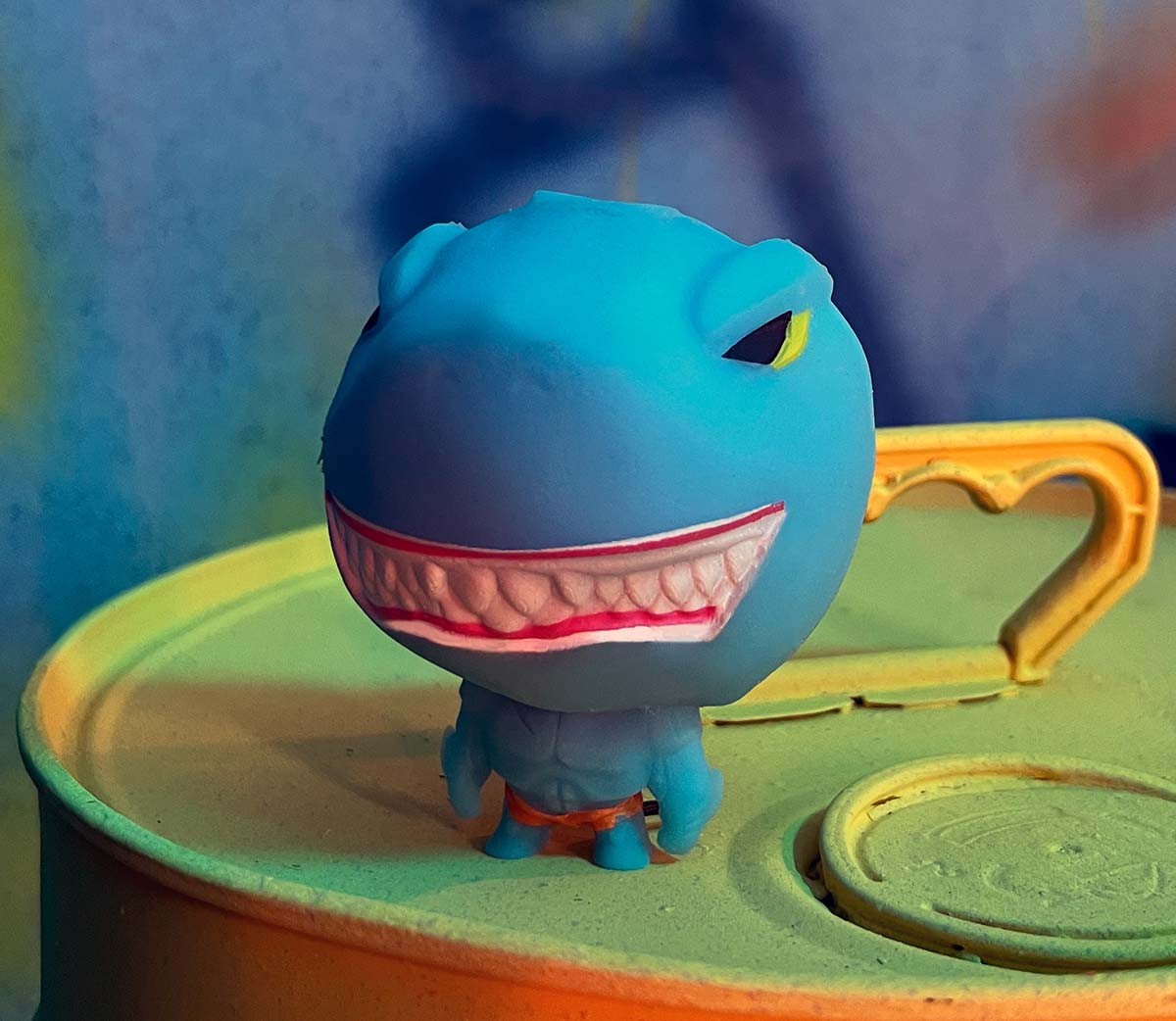 Sharky è un personaggio Elastikorps HeroPOP, una collezione di 12 personaggi squishabily, stretchabili e vellutati al tatto.