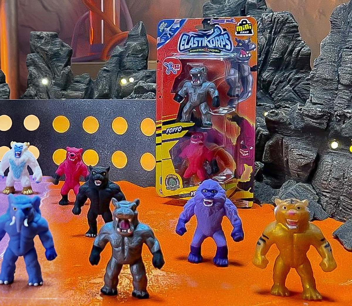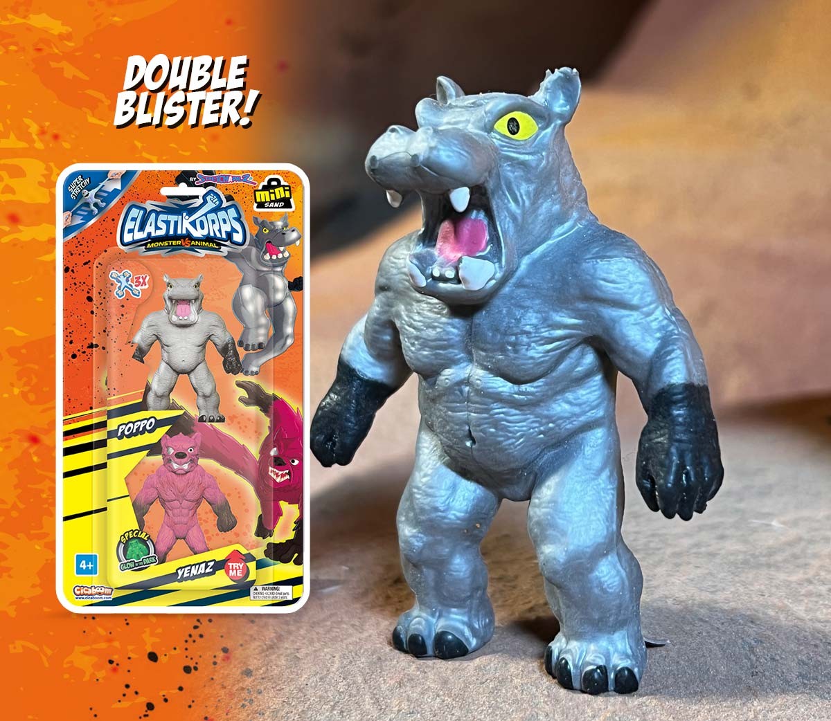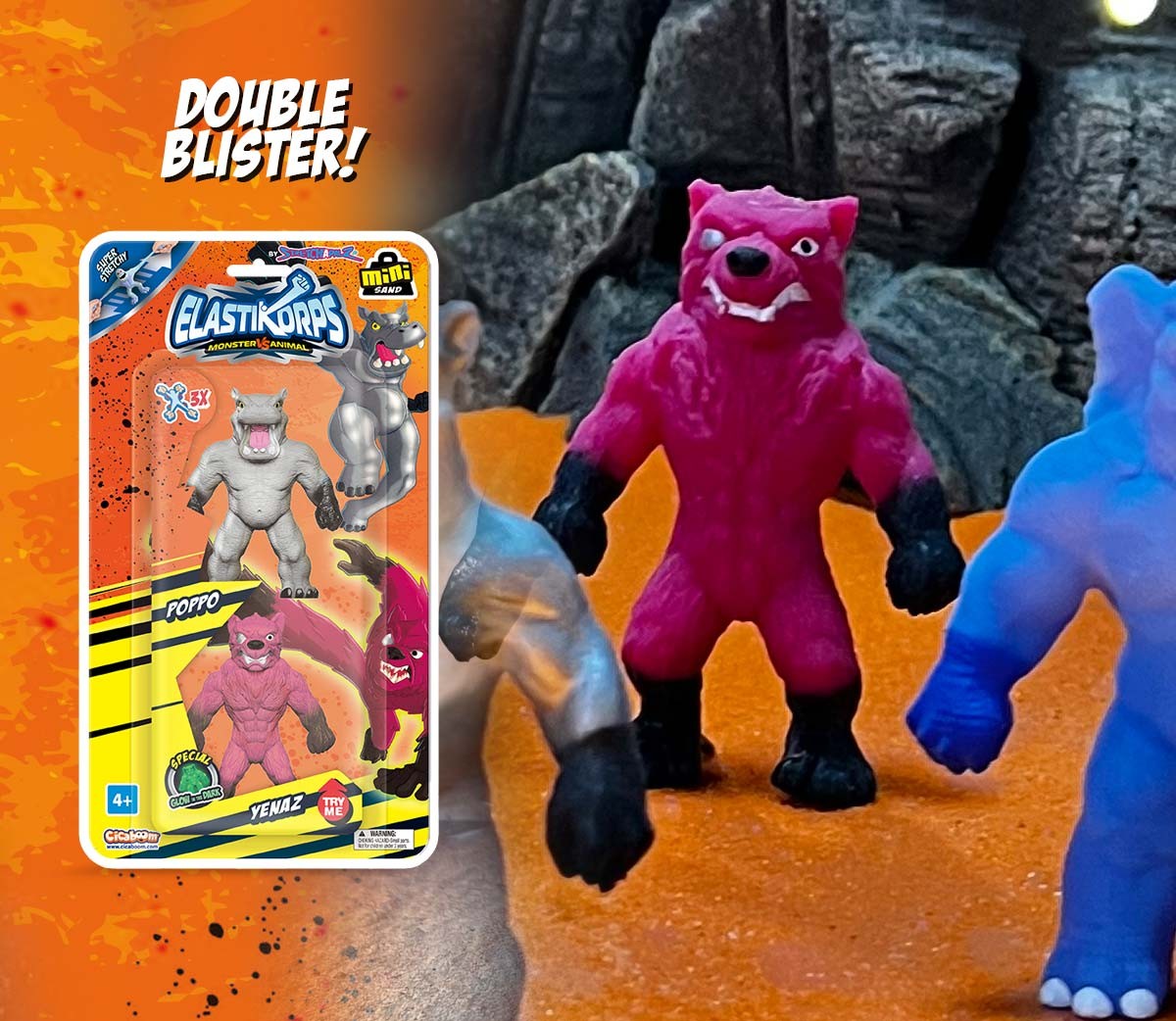 Poppo e Yenaz appartengono alla squadra degli Animali nella collezione Elastikorps Monster Vs Animal, 12 action figure elastiche, alte 8 cm e vellutate al tatto.