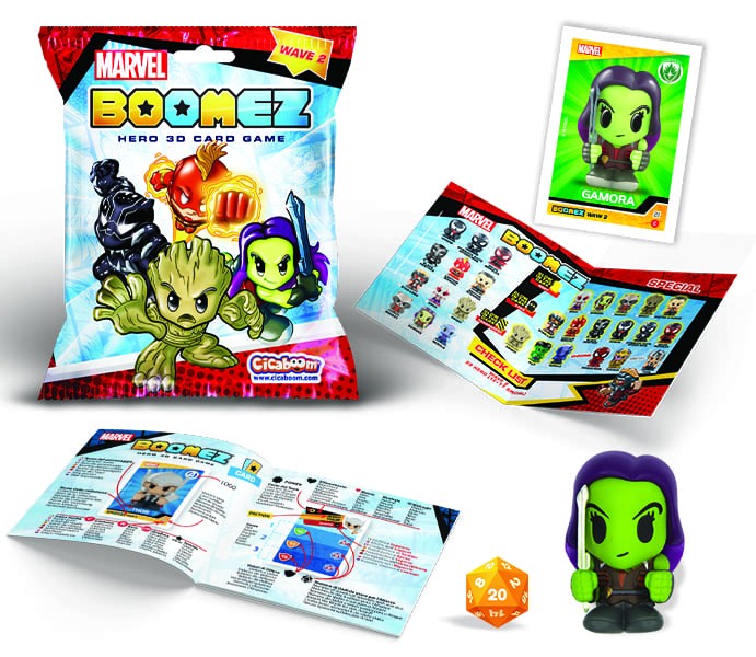 - In ogni bustina troverai: 1 Marvel Boomez 2 + la sua card di plastica lucida + 1 dado a 20 facce + checklist + regolamento di gioco.