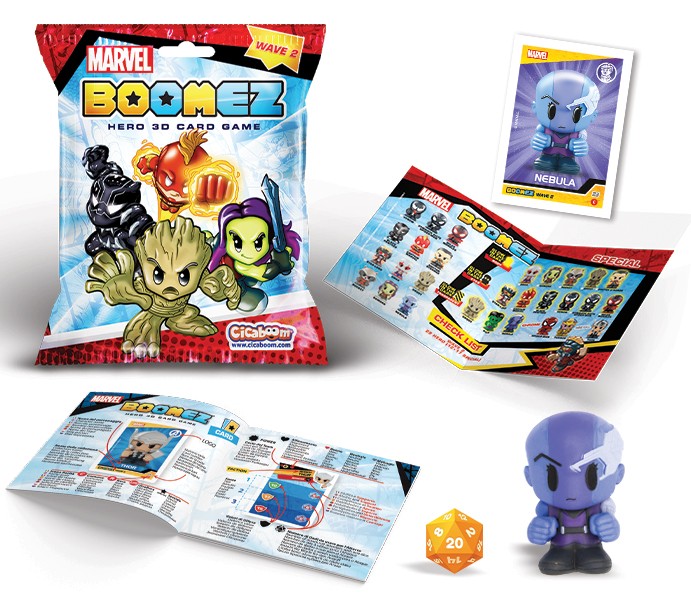 - In ogni bustina troverai: 1 Marvel Boomez 2 + la sua card di plastica lucida + 1 dado a 20 facce + checklist + regolamento di gioco