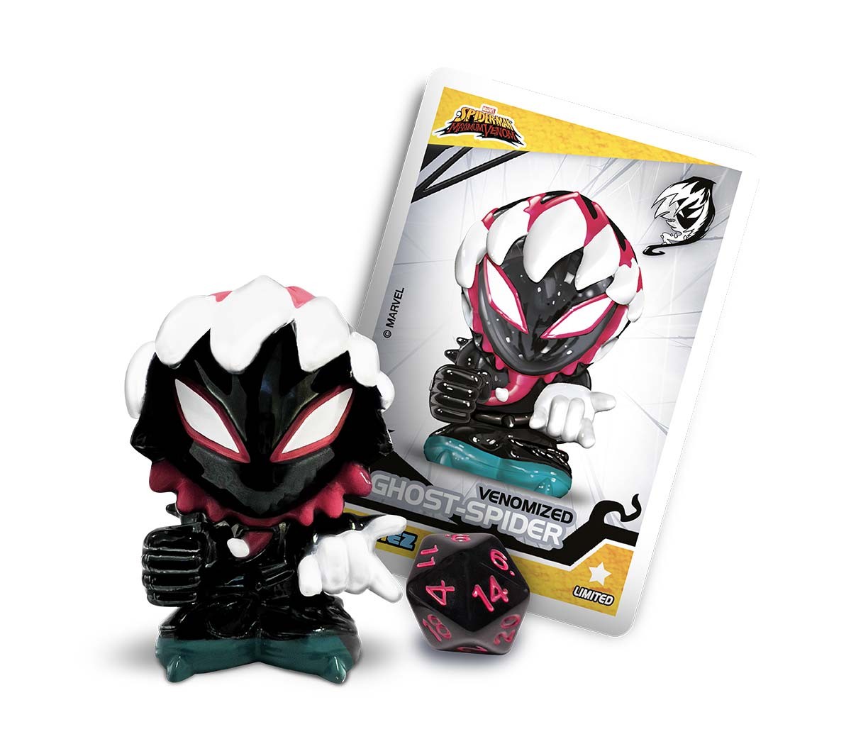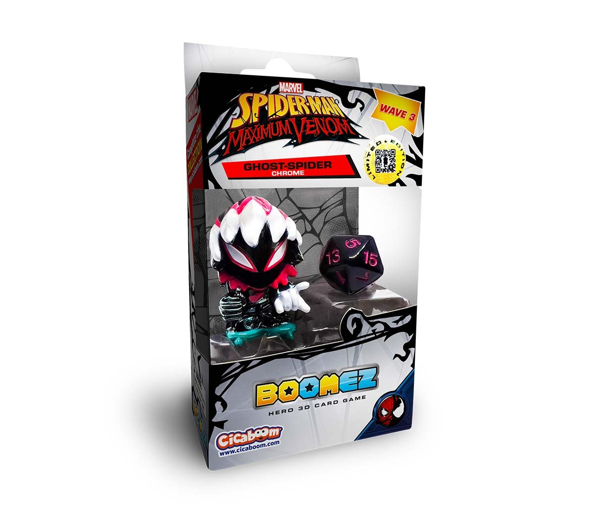 Ghost-Spider Chrome è venduto all'interno di un rifinito box trasparente da esporre nella propria collezione, all'interno del quale troverai anche una carta da gioco e un dado da 20 per sfidare i tuoi amici al divertentissimo Boomez 3D Card Game.