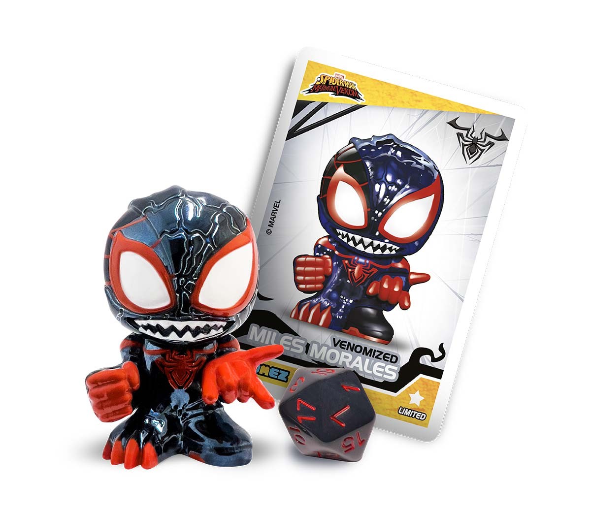 Miles Morales Chrome è venduto all'interno di un rifinito box trasparente da esporre nella propria collezione, all'interno del quale troverai anche una carta da gioco e un dado da 20 per sfidare i tuoi amici al divertentissimo Boomez 3D Card Game.