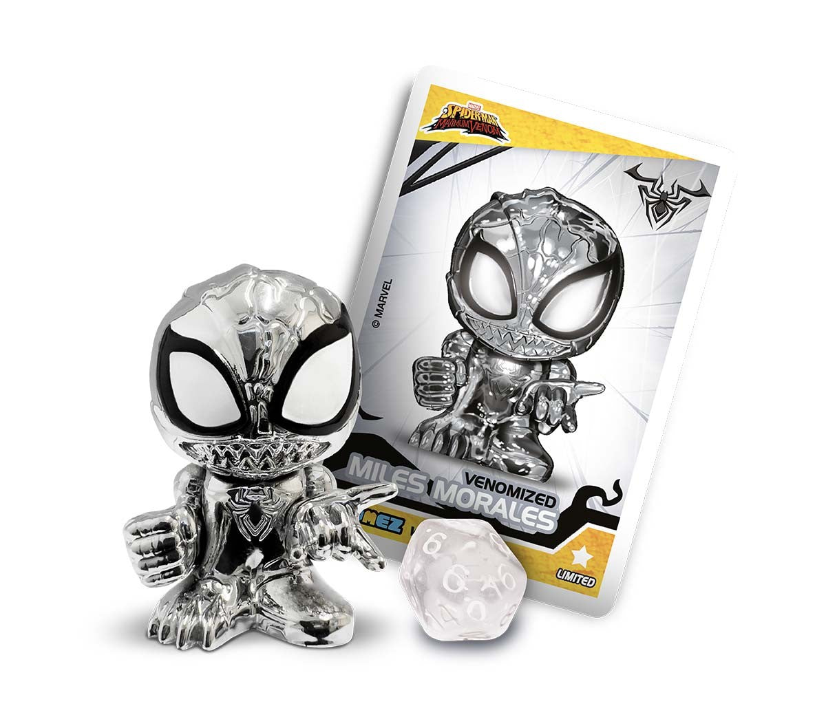Miles Morales Chrome Silverè venduto all'interno di un rifinito box trasparente da esporre nella propria collezione, all'interno del quale troverai anche una carta da gioco e un dado da 20 per sfidare i tuoi amici al divertentissimo Boomez 3D Card Game.