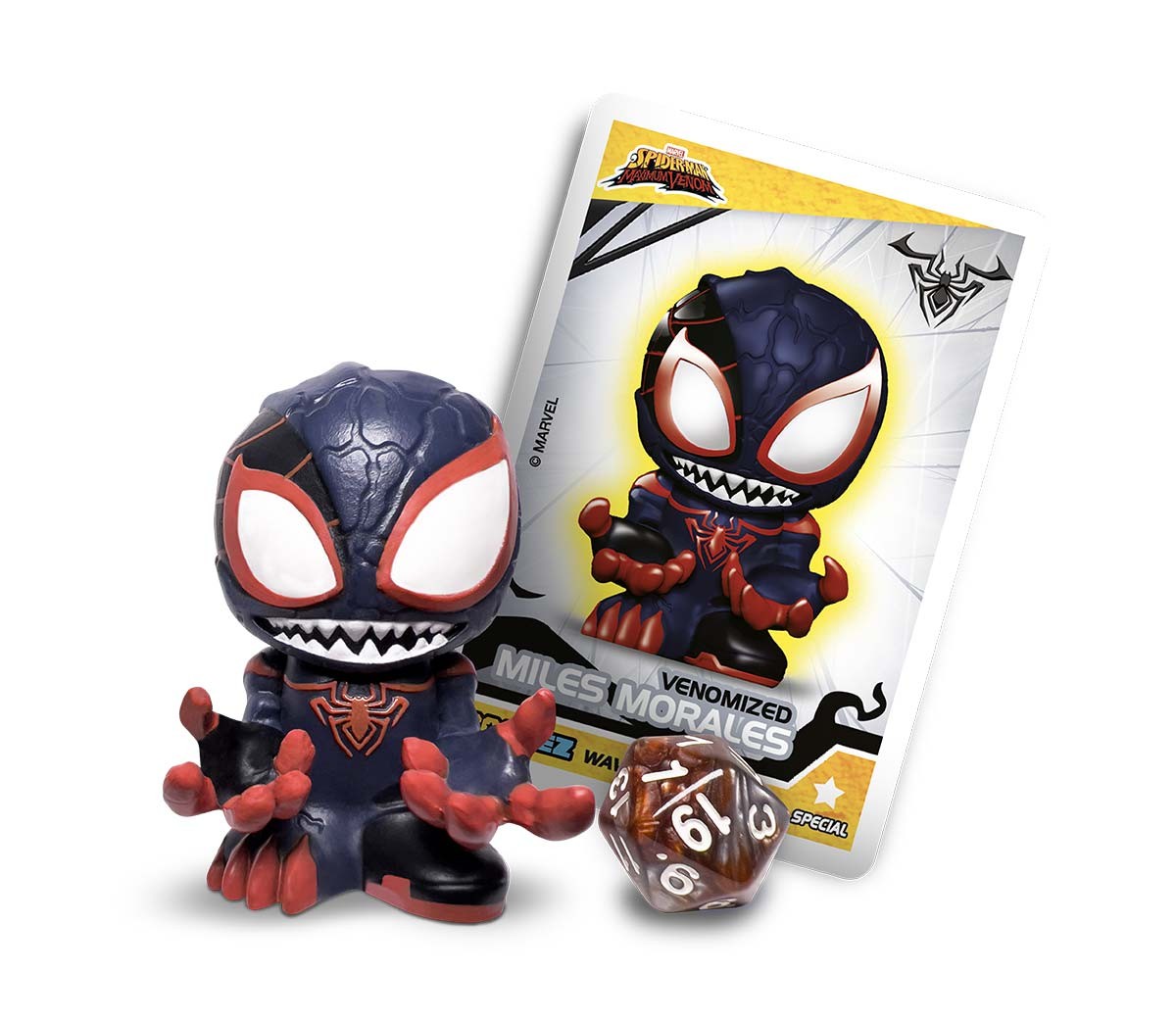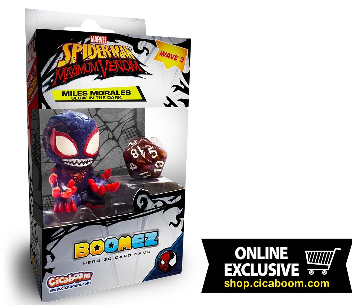Miles Morales Glow in the Dark è venduto all'interno di un rifinito box trasparente da esporre nella propria collezione, all'interno del quale troverai anche una carta da gioco e un dado da 20 per sfidare i tuoi amici al divertentissimo Boomez 3D Card Game.