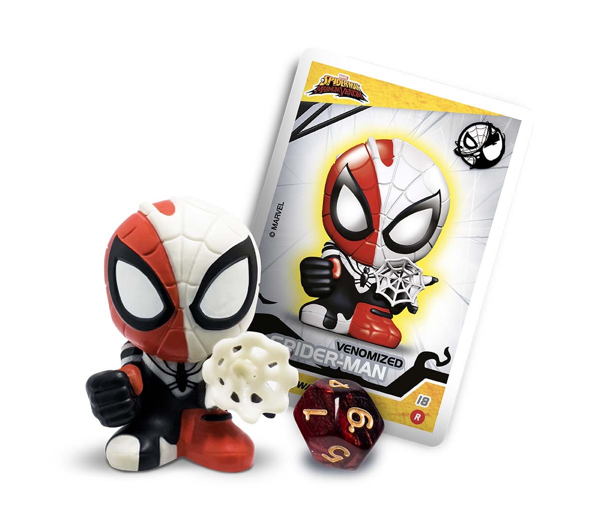 Spider-Man Glow in the Dark è venduto all'interno di un rifinito box trasparente da esporre nella propria collezione, all'interno del quale troverai anche una carta da gioco e un dado da 20 per sfidare i tuoi amici al divertentissimo Boomez 3D Card Game.