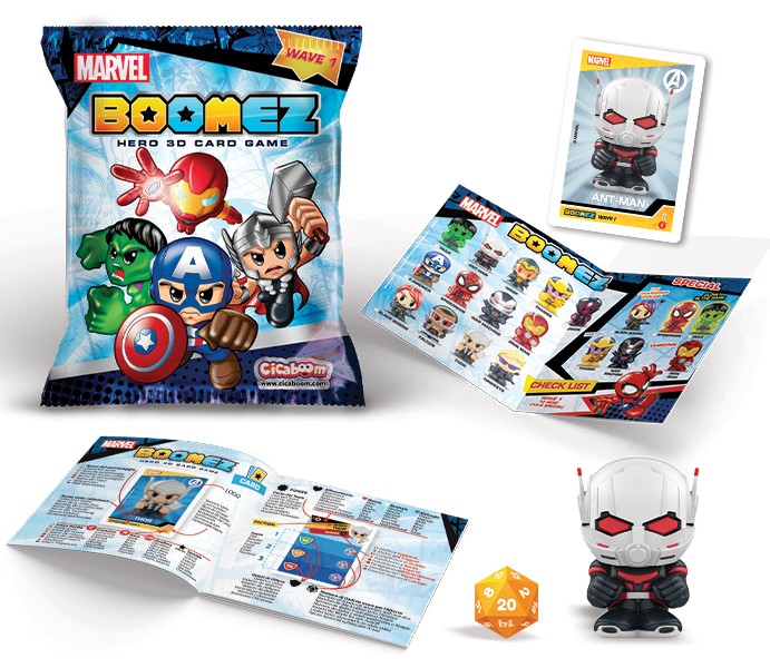 Ogni Boomez è accompagnato da una carta da gioco e da un dado da 20 facce per sfidare i tuoi amici al divertentissimo Boomez 3D Card Game.