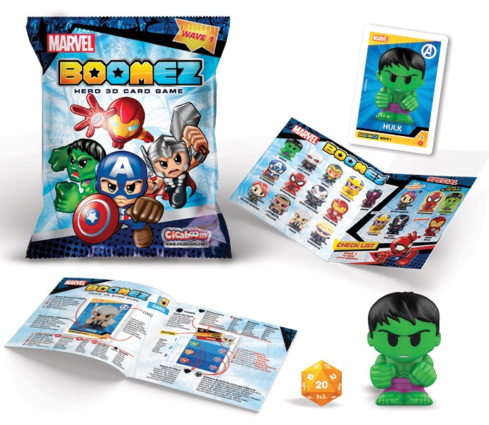 Ogni Boomez è accompagnato da una carta da gioco e da un dado da 20 facce per sfidare i tuoi amici al divertentissimo Boomez 3D Card Game.