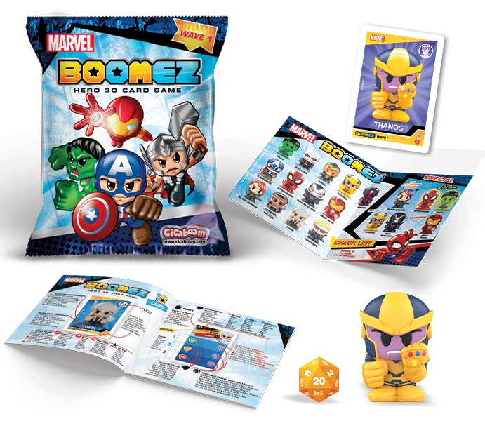 Ogni Boomez è accompagnato da una carta da gioco e da un dado da 20 facce per sfidare i tuoi amici al divertentissimo Boomez 3D Card Game.