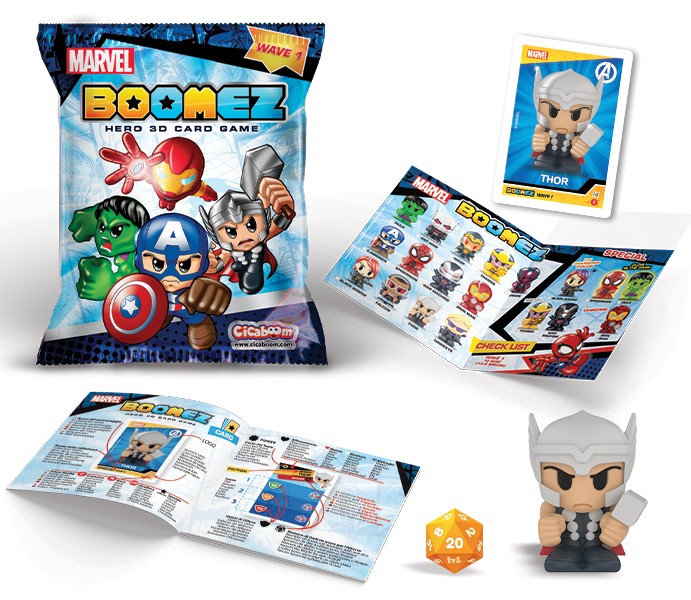 Ogni Boomez è accompagnato da una carta da gioco e da un dado da 20 facce per sfidare i tuoi amici al divertentissimo Boomez 3D Card Game.